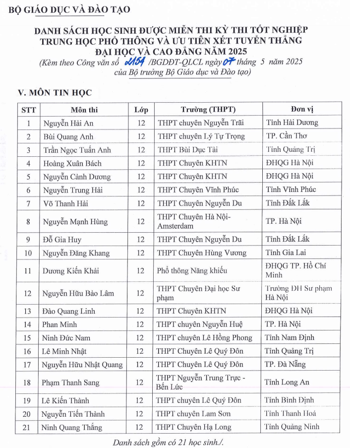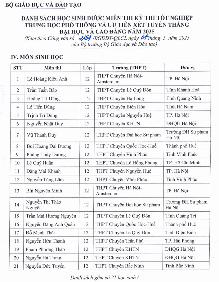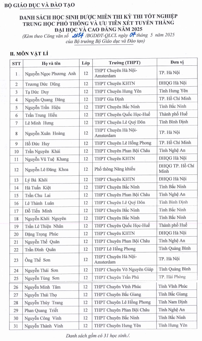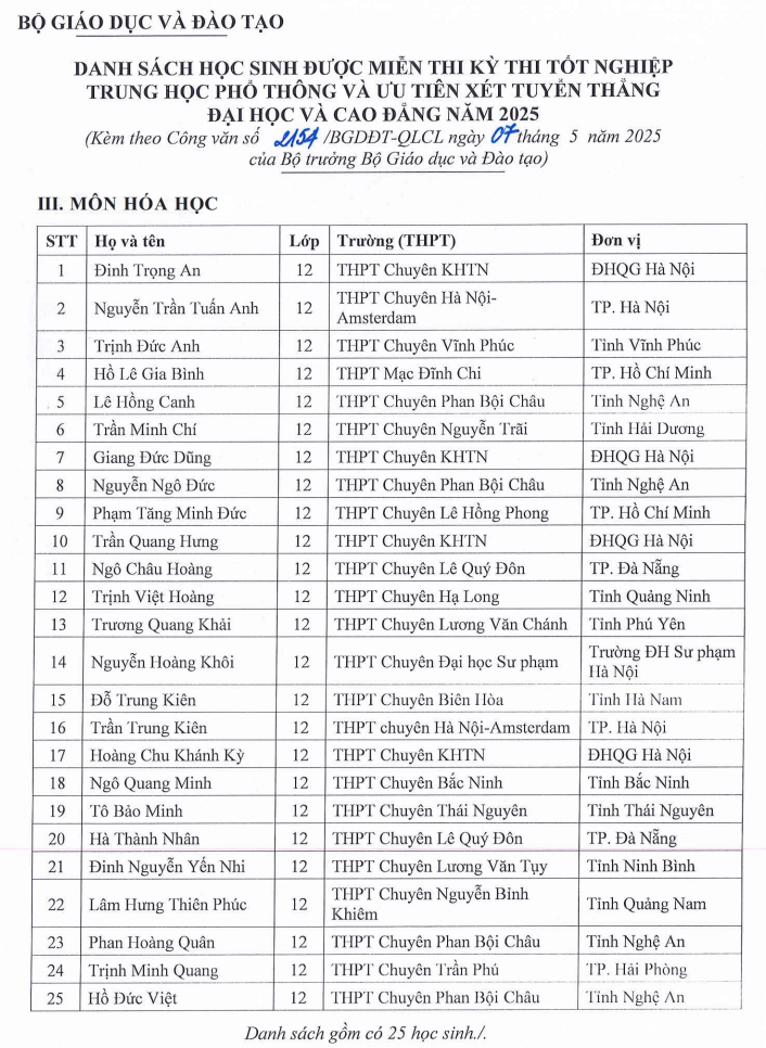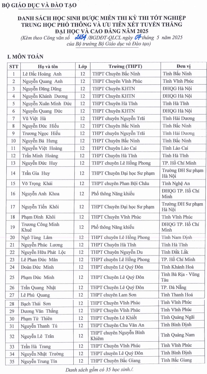 Bộ GD&ĐT vừa công bố danh sách 133 học sinh được miễn thi tốt nghiệp THPT năm 2025 và được tuyển thẳng vào đại học năm 2025