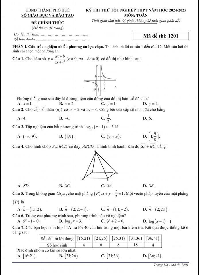 Đề thi thử tốt nghiệp THPT môn Toán năm 2025 của thành phố Huế với thời gian làm bài 90 phút như sau: