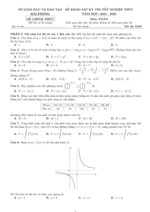 Đáp án, đề thi thử tốt nghiệp THPT năm 2025 môn Toán của Sở Giáo dục và Đào tạo Hải Phòng như sau: