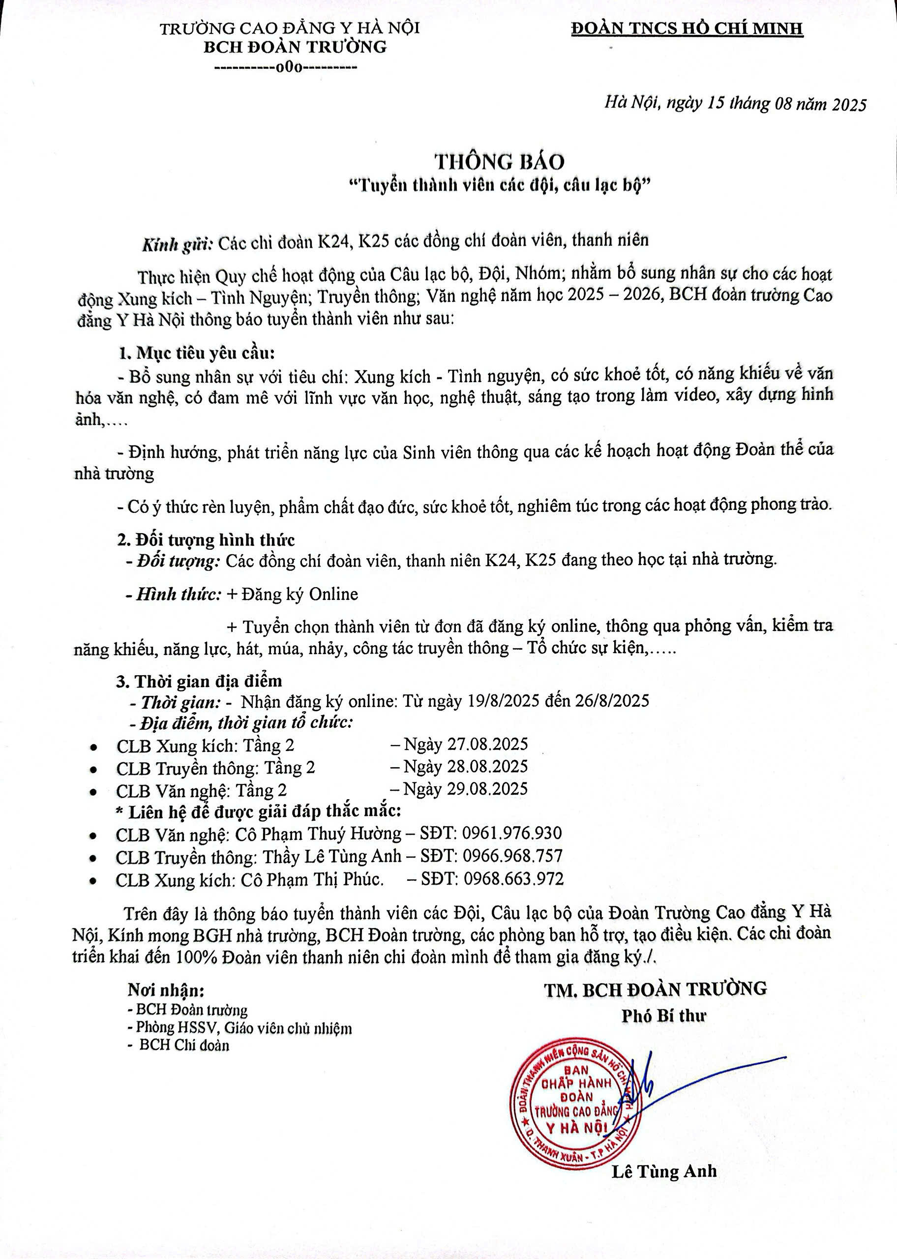 Nhằm tạo sân chơi bổ ích và phát huy năng lực, sức trẻ của sinh viên, BCH Đoàn Trường Cao đẳng Y Hà Nội chính thức thông báo tuyển thành viên cho các Câu lạc bộ: Xung kích, Truyền thông, Văn nghệ năm học 2025 – 2026.